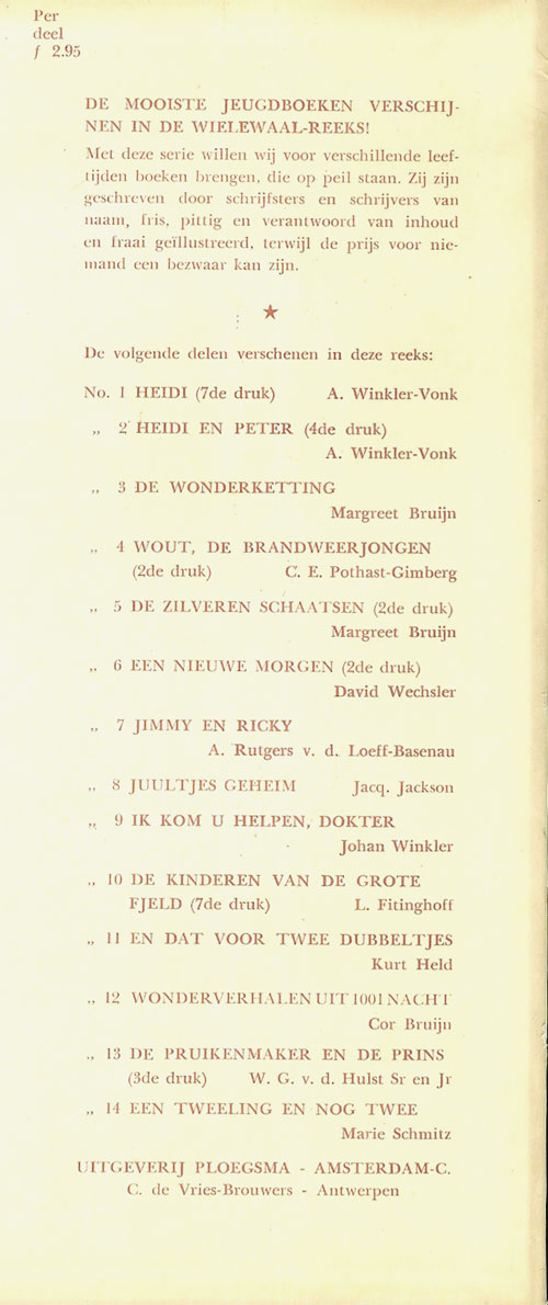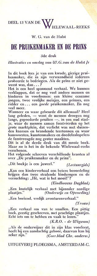 Deel 13 De pruikenmaker en de prins door W.G. van de Hulst Illustraties en omslag van W.G. van de Hulst jr. 3e druk 1956 -1e druk in de Wielewaal-reeks - 112 pag. geb. ƒ2,95 |