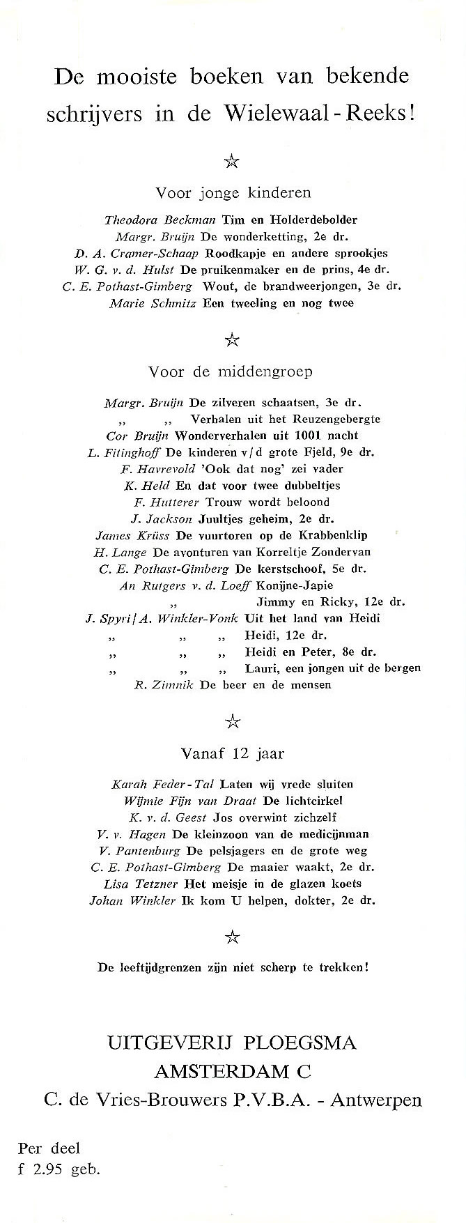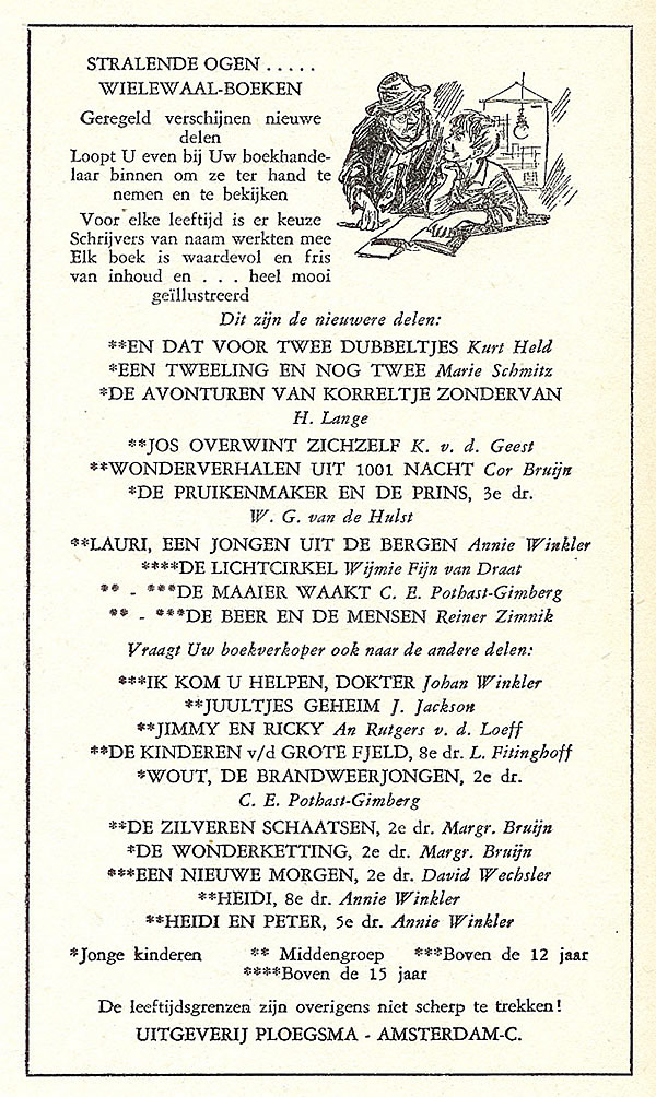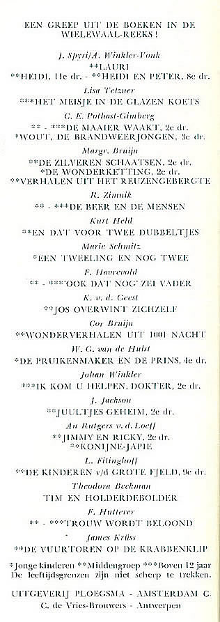 | Op de meeste stofomslagen staat in een hoekje een globale leeftijdsaanduiding hoewel die volgens de stofomslag van Uit het land van Heidi niet scherp te trekken zijn. ![]() |