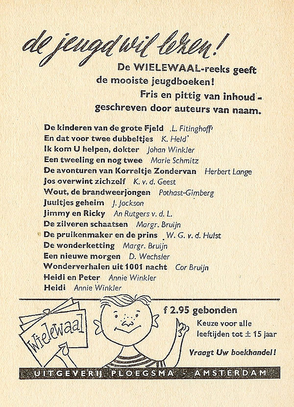 Deel 2 Heidi en Peter, vrij bewerkt naar Johanna Spyri en de gelijknamige film van PRAESENS-FILM - ZÜRICH door Annie Winkler-Vonk Met acht filmfotos's 7e druk 1957 - 112 pag. geb. ƒ2,95 |