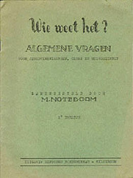 Wie weet het? Algemene vragen voor jeugdverenigingen, clubs en huisgebruik. Samengesteld door M. Noteboom. 2e deeltje - algemene vragen. Het 1e deeltje gaat over bijbelse vragen. Uitgave: Hervormd Bondsbureau - Hilversum Met dank aan Rens Strijbos: "Het betreft een gestencilde bijdrage van M. Noteboom, de organisator van de boekbeoordelingen van de Herv. Kerk op G.G., een vragenboekje. De bijdrage is gering besef ik, maar quizvragen heb je nog niet." |