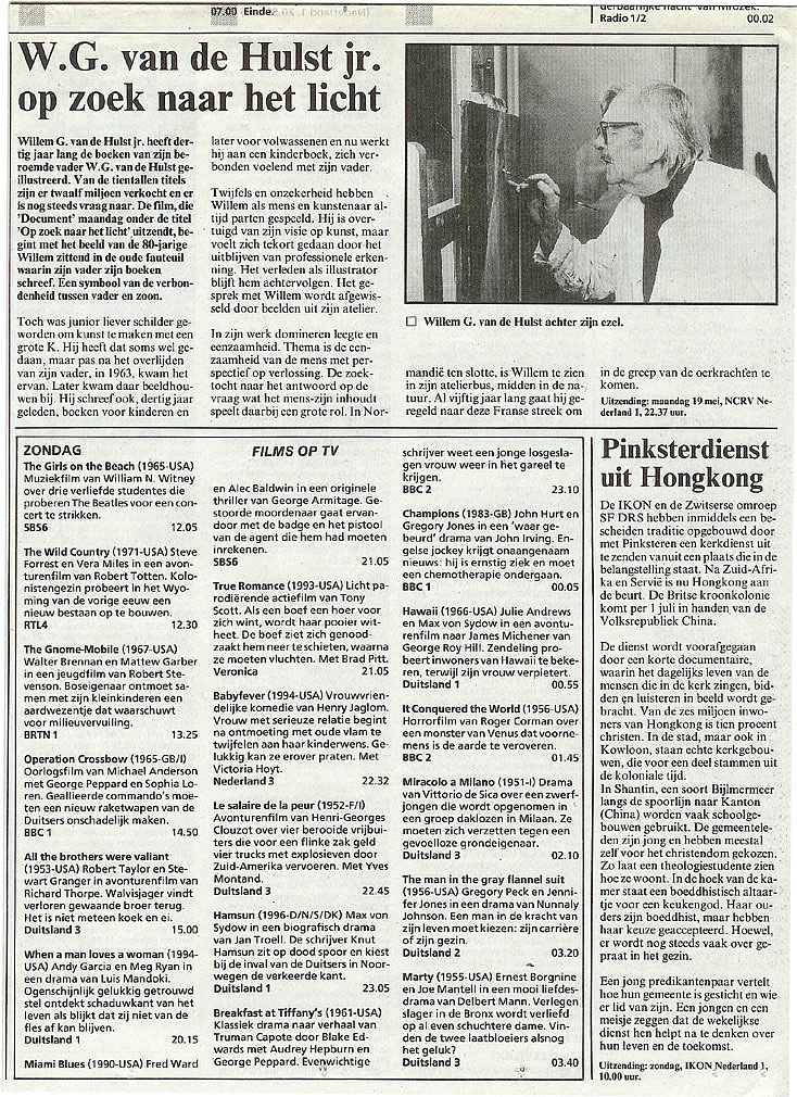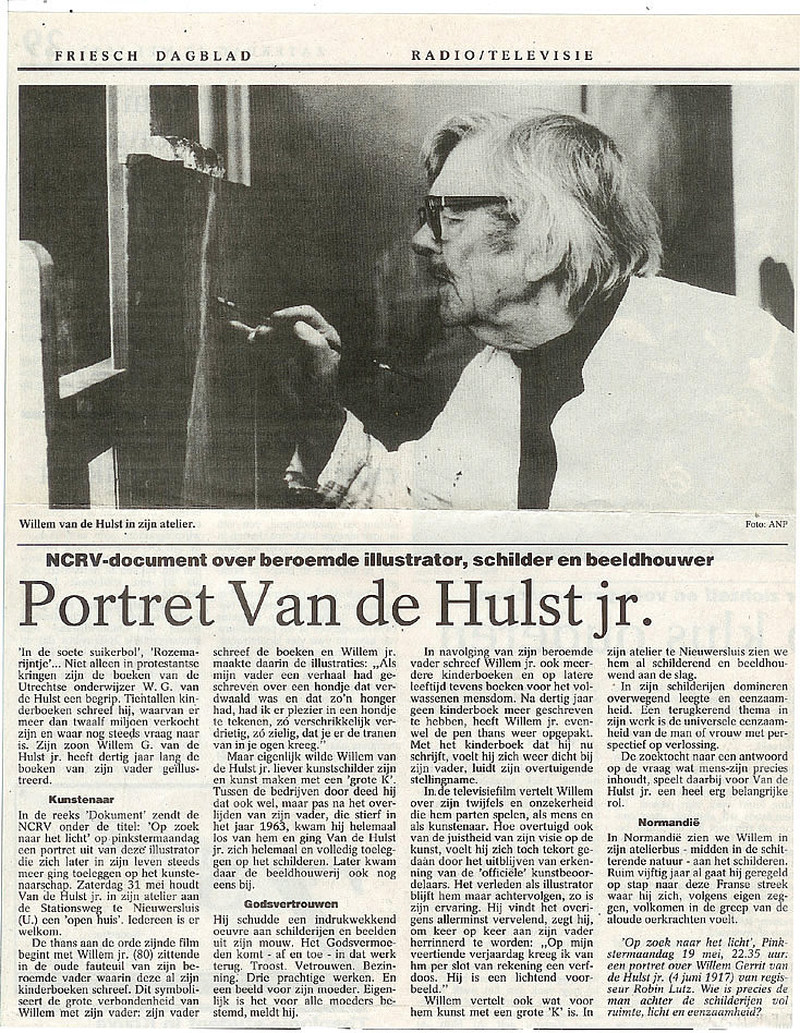 | Wat bij Van de Hulst sr nog maar sporadisch aan de orde is komt vanzelfsprekend bij Willem G. van de Hulst veel vaker voor: belangstelling van de media voor zijn kunstzinnige scheppingen. Naast het grote aantal kranten - en tijdschriftartikelen is er vanaf de 70-er jaren met regelmaat iets te zien en te horen van Willem G. van de Hulst. De uitzending van 'Inde Soete Suikerbol' in 1973 is een mijlpaal in het illustratief werk en de grote documentaire 'Op zoek naar het licht' uit 1997 een hommage aan de beeldend kunstenaar. | |||||||