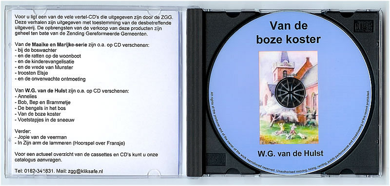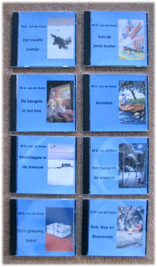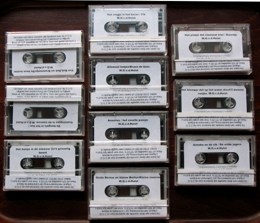 Vertelcassettes Voor onze kleinen Ten bate van de Zending van de Gereformeerde Gemeenten zijn ruim honderd vertelcassettes en -CD's uitgegeven waaronder een tiental met verhalen Voor onze kleinen van W.G. van de Hulst sr. Per cassette zijn twee verhalen te beluisteren. Behalve Het kerstfeest van twee domme kindertjes (deel 15) zijn alle verhalen opgenomen. De vertelsters zijn me (nog) niet bekend. De illustraties op de omslagen zijn van W.G. van de Hulst.jr |