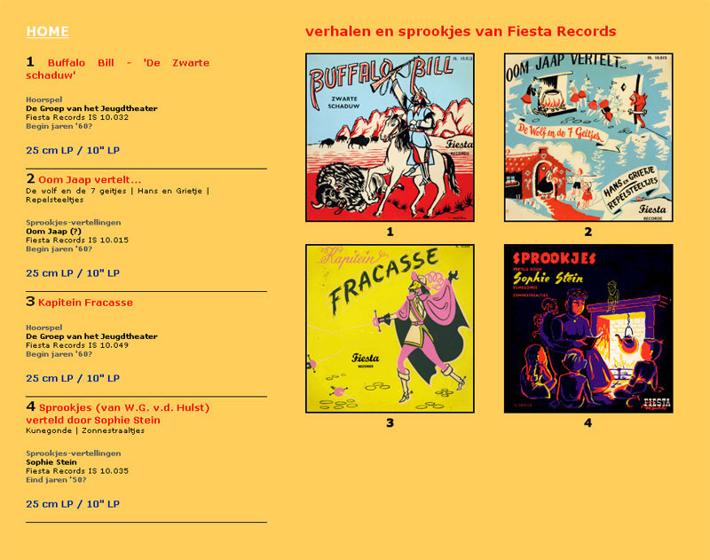 | Sprookjes verteld door Sophie Stein: Kunegonde en Zonnestraaltjes Twee verhalen uit Het grote voorleesboek Met dank aan Peter Oosterhout die op zijn fraaie internetsite Minigroove vier langspeelplaten van Fiesta Records toont waaronder de twee verhalen van W.G. van de Hulst. De omslagillustratie van de LP is onmiskenbaar terug te herleiden naar de stofomslag van de eerste drukken van Het grote voorleesboek. Sophie Stein is vooral bekend geworden van haar rol als Moeder Doorsnee in In Holland staat een huis van Annie M.G. Schmidt klik voor de website |