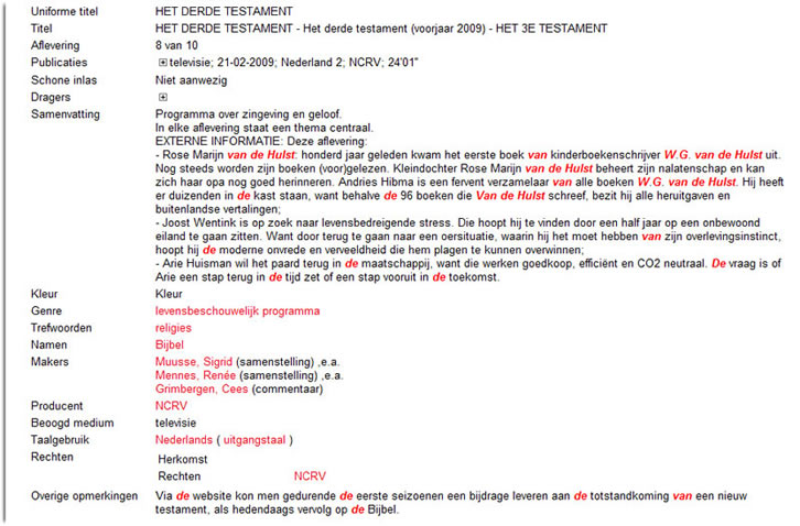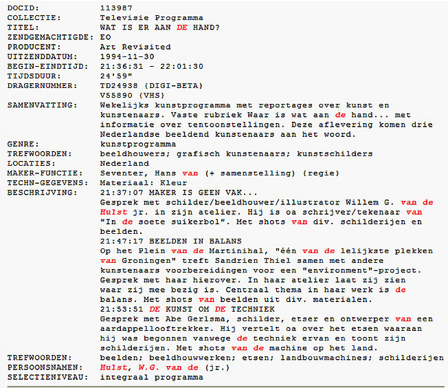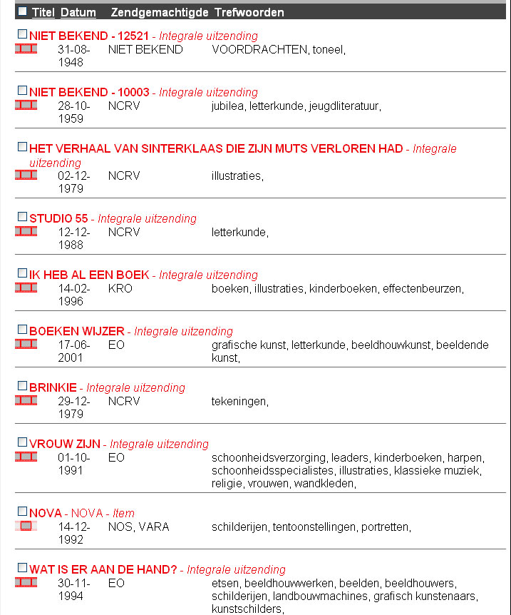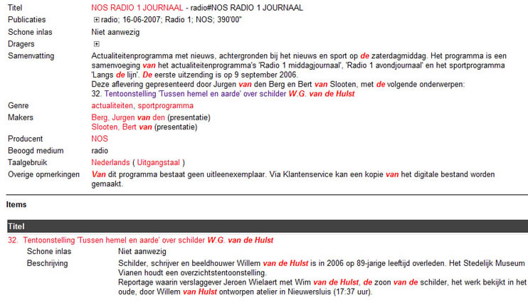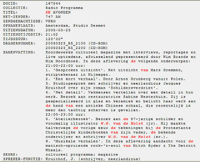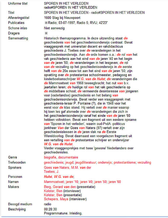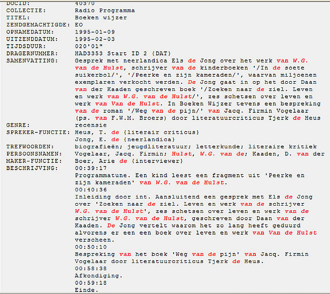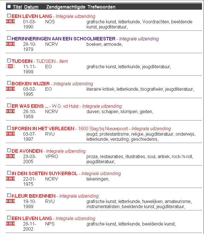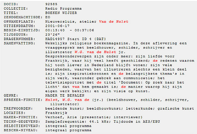 Radio en televisie Vanaf 1930 worden regelmatig verhalen, hoorspelen, animatiefilms, intervieuws en documentaires uitgezonden omtrent W.G. van de Hulst sr en Willem G. van de Hulst. Voor zover mogelijk worden hieronder de bijzonderheden met betrekking tot de uitzendingen weergegeven waaronder met name de formele gegevens van het grote documentatiearchief Nederlands Instituut voor Beeld en Geluid, Media Park, Sumatralaan 45, Postbus 1060, 1200 BB Hilversum. Door hier of op de onderstaande afbeelding te klikken wordt je direkt doorgelinkt naar de website van Beeld en geluid te Hilversum. |