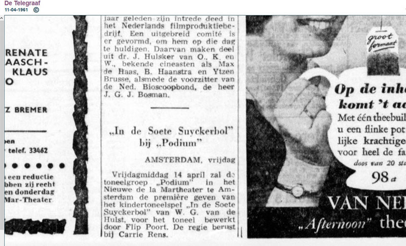 Toneel 14 april 1961 Toneelgroep ,, Podium '' speelt ,,In de Soete Suyckerbol'' voor toneel bewerkt door Flip Poort In het Nieuwe de la Martheater te Amsterdamde. |