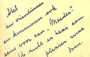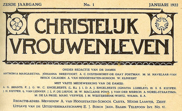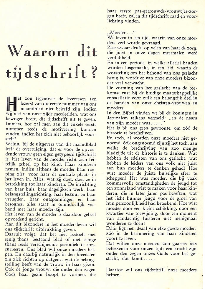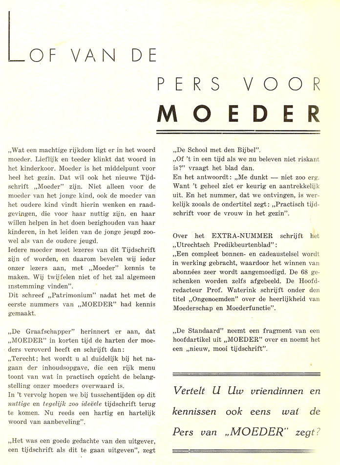 ![]() De omslagillustraties van Herman Dijkstra voor de 12 nummers zijn nagenoeg gelijk. Alleen zijn er soms andere kleuren gebruikt of zijn er kleine (geschreven) teksten toegevoegd. De linnen banden zijn soms verschillend bedrukt Januari 1941, nr. 1, pag. 11: In het artikel Godsdienstige vorming II van J.H.Ruijsch-van Dugteren wordt het voorwoord van Van de Hulst uit Bijbelsche geschiedenissen geciteerd. Op pag. 29: In Vragen van moeders wordt de kinderbijbel van Van de Hulst besproken. ![]() |