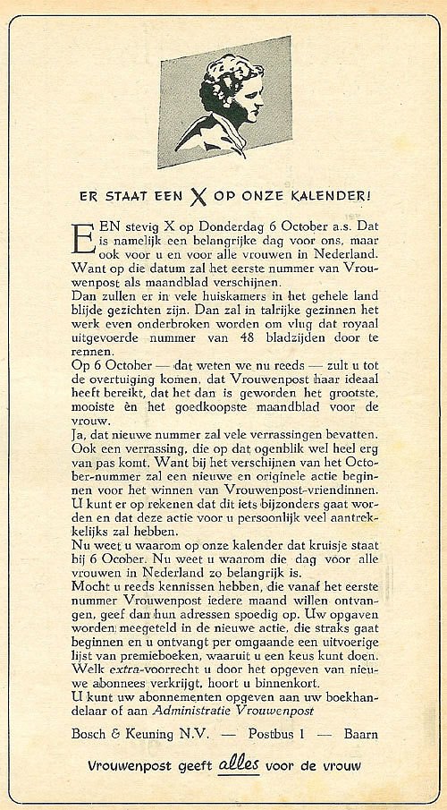 | Zoals boven reeds vermeld is Vrouwenpost een voortzetting van het vooroorlogse Christelijk Vrouwenleven. In de jaren 1941 en 1942 is het min of meer opgenomen in het deftigere blad Wij jonge vrouwen. Na 1945 is dat niet meer verschenen vanwege de langdurige slechte papierkwaliteit. Vrouwenpost verschijnt aanvankelijk eenmaal per veertien dagen bij uitgevers Bosch & Keuning N.V. te Baarn. Vanaf 6 October 1949 wordt het een maandblad. De 5e jaargang eindigt met nr 19 op 17 September 1949. Vanaf October 1949 begint dan de 6e jaargang, een belangrijk moment voor alle vrouwen van Nederland, getuige de aankondiging in het laatste veertiendaagse nummer uit September 1949. |